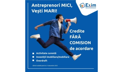 Exim Banca Românească derulează o campanie promoțională, dedicată dezvoltării micilor afaceri, în cadrul căreia reduce costurile de finanțare facilitând astfel accesul antreprenorilor la resursele necesare pentru activitatea curentă sau implementarea planurilor de dezvoltare.